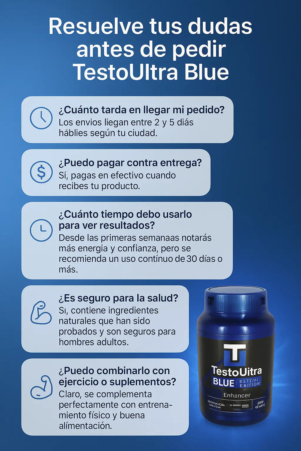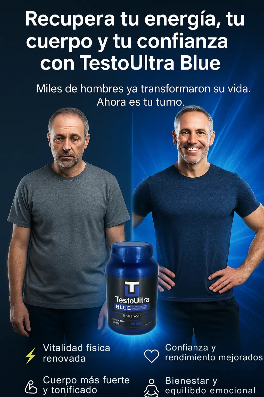 No es que hayas cambiado tu. Es que tu cuerpo esta pidiendo apoyo real para volver a responder como lo hacia antes. Testo Ultra Blue es parte de un ritual masculino natural que te ayuda a recuperar tu energía, tu impulso y esa conexión intima que en algún momento se sintió inquebrantable.
